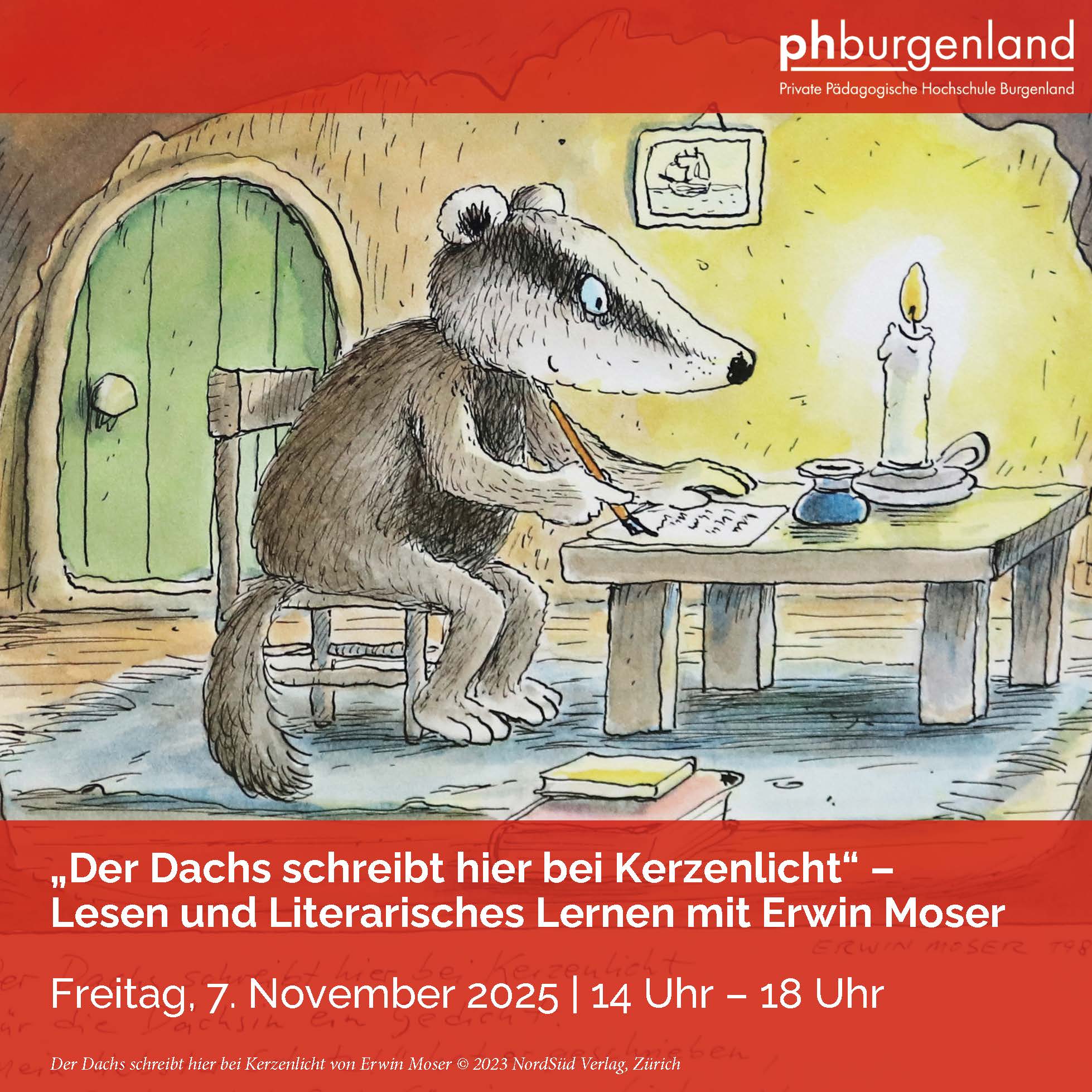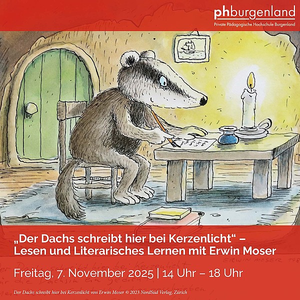 An der PH Burgenland findet am 07.11.2025 ein Nachmittag zu Erwin Moser statt. Unter dem Titel „Der Dachs schreibt hier bei Kerzenlicht“ – Lesen und Literarisches Lernen mit Erwin Moser werden Vorträge und Workshops angeboten: